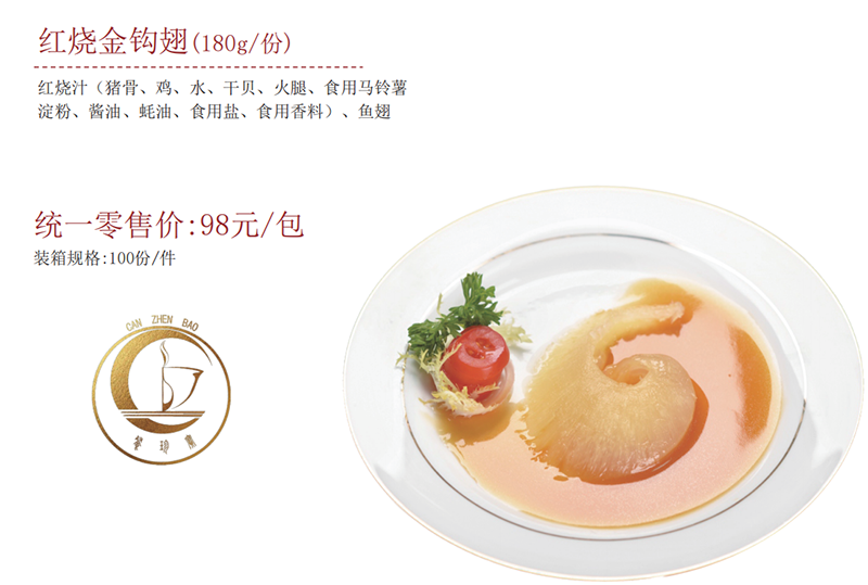 紅燒金鉤翅(180g/份) 紅燒汁(豬骨、雞、水、干貝、火腿、食用馬鈴薯 淀粉、醬油、蠔油、食用鹽、食用香料)、魚翅 統(tǒng)一零售價:98元/包 裝箱規(guī)格:100份/件 共0條 相關(guān)評論 |