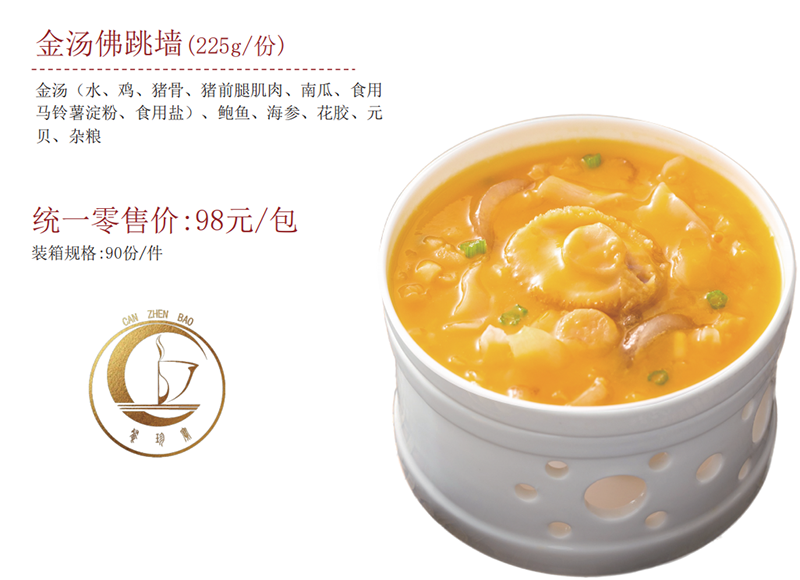 金湯佛跳墻(225g/份) 金湯(水、雞、豬骨、豬前腿肌肉、南瓜、食用 馬鈴薯淀粉、食用鹽)、鮑魚、海參、花膠、元 貝、雜糧 統(tǒng)一零售價:98元/包 裝箱規(guī)格:90份/件 共0條 相關(guān)評論 |