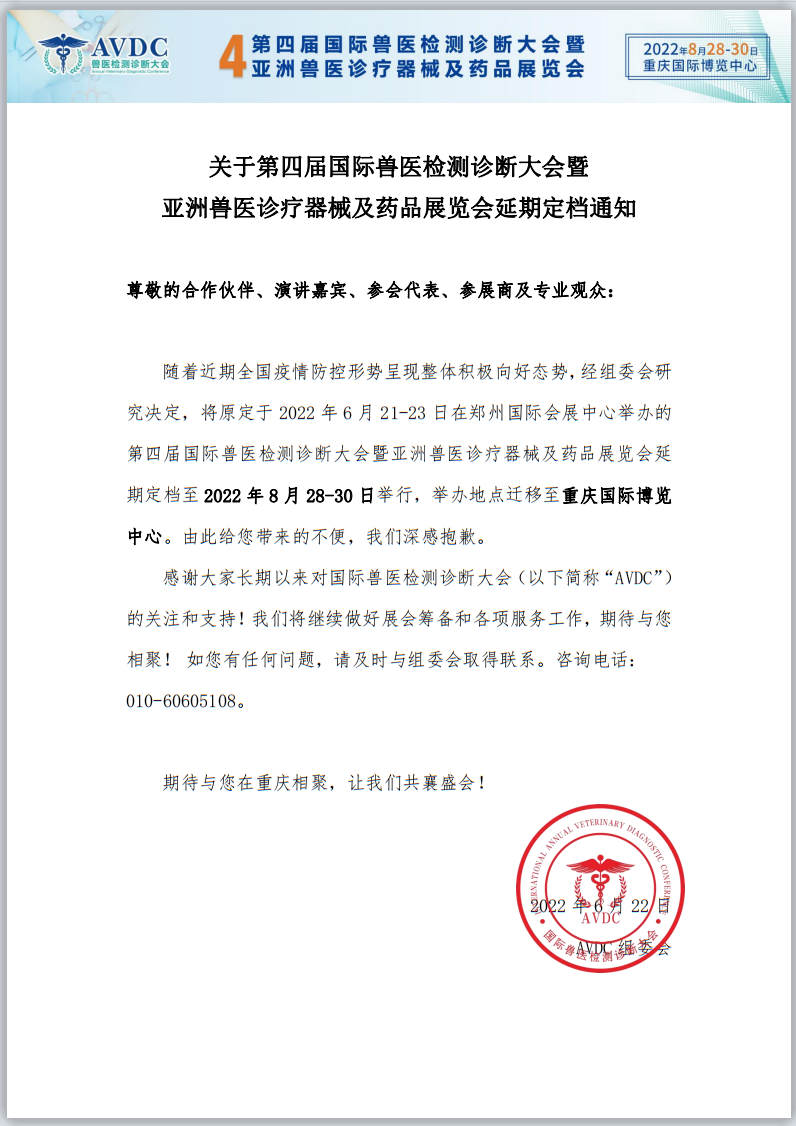 隨著近期全國疫情防控形勢(shì)呈現(xiàn)整體積極向好態(tài)勢(shì),經(jīng)組委會(huì)研究決定,將原定于2022621-23日在鄭州國際會(huì)展中心舉辦的第四屆國際獸醫(yī)檢測(cè)診斷大會(huì)暨亞洲獸醫(yī)診療器械及藥品展覽會(huì)延期定檔至2022828-30舉行,舉辦地點(diǎn)遷移至重慶國際博覽中心。由此給您帶來的不便,我們深感抱歉。
