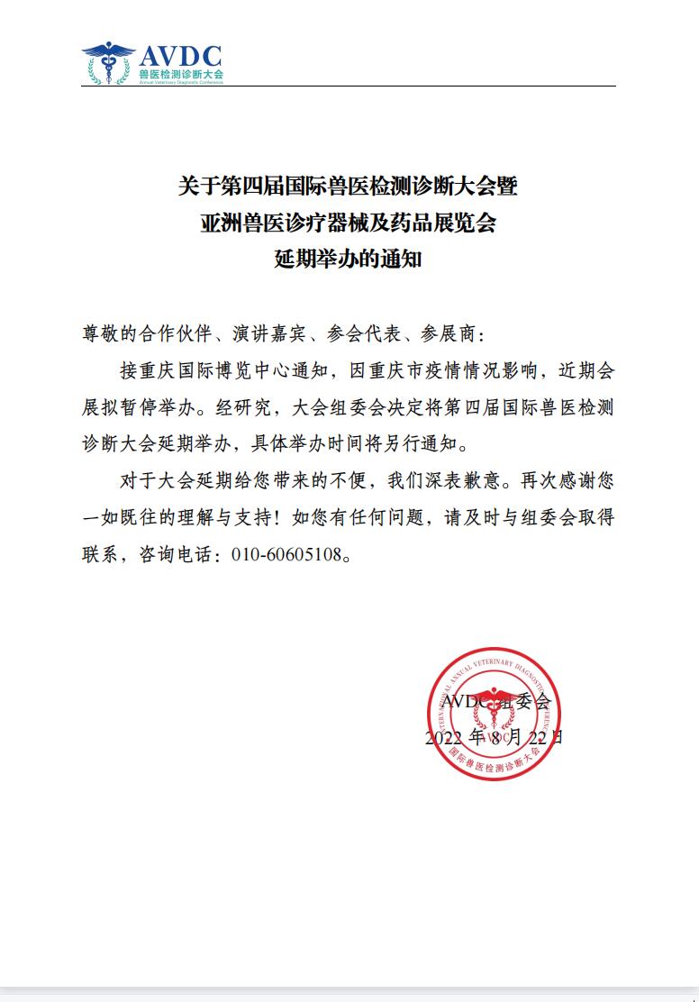 接重慶國際博覽中心通知,因重慶市疫情情況影響,近期會 展擬暫停舉辦。經(jīng)研究,大會組委會決定將第四屆國際獸醫(yī)檢測 診斷大會延期舉辦,具體舉辦時(shí)間將另行通知。