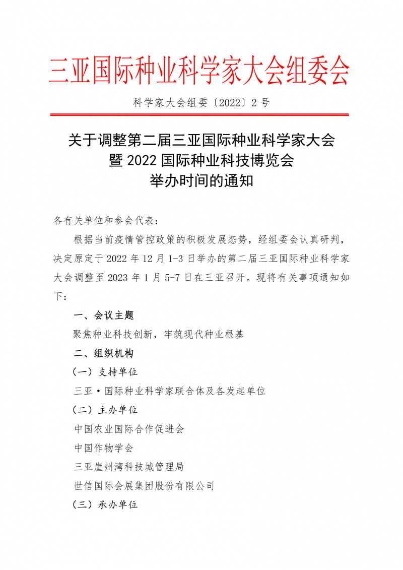 定檔!第二屆三亞國(guó)際種業(yè)科學(xué)家大會(huì)暨2022國(guó)際種業(yè)科技博覽會(huì)于1月5日召開(kāi)!