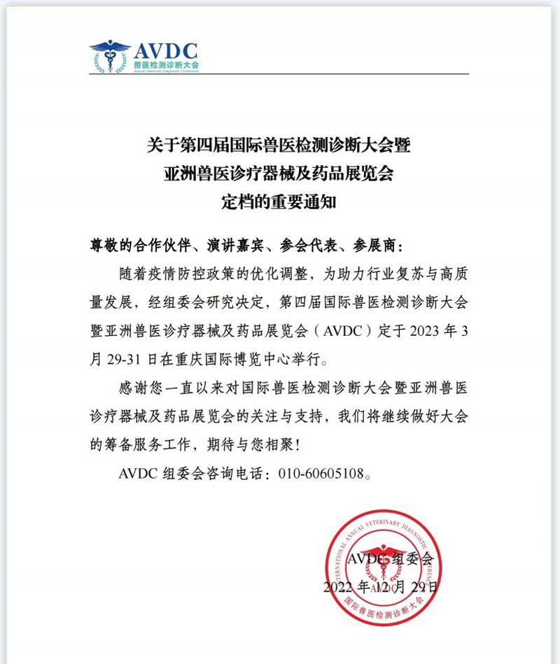 隨著疫情防控政策的優(yōu)化調整,為助力行業(yè)復蘇與高質量發(fā)展,經(jīng)組委會研究決定,第四屆國際獸醫(yī)檢測診斷大會暨亞洲獸醫(yī)診療器械及藥品展覽會(AVDC)定于2023年3月29-31日在重慶國際博覽中心舉行。