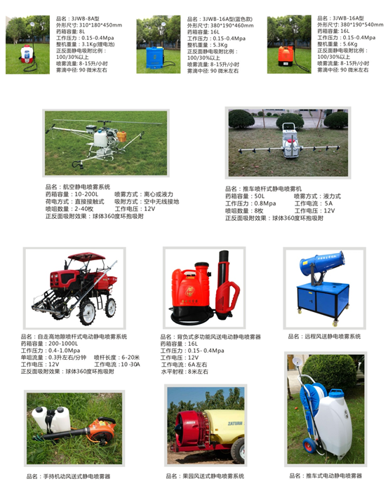 靜電噴霧器是指能使噴出的霧滴在靶標(biāo)物上產(chǎn)生顯著的靜電環(huán)抱吸附效果的噴霧器(國作登字-2020-A-01059391)。形成了中國創(chuàng)造的靜電噴霧吸附技術(shù)的基本原理理論:靜電噴霧技術(shù)是根據(jù)同種電荷相互排斥、異種電荷相互吸引的物理學(xué)原理,利用同一高壓靜電發(fā)生器產(chǎn)生輸出的正負(fù)靜電高壓,采用相應(yīng)的荷電方式,分別讓靶標(biāo)及噴出的霧滴帶上不同極性的靜電荷,從而建立以高壓靜電發(fā)生器的高壓電源輸出端為中心的閉合電流回路,也就是搭建構(gòu)成一個(gè)有源的靜電場(chǎng)。當(dāng)噴頭噴出的帶有一種極性電荷的霧滴在噴霧器的推送力、地球引力和電場(chǎng)力的多重作用下,沿電場(chǎng)線沉降至靶標(biāo)附近時(shí),在異性電荷相互吸引的作用下,帶有一種極性靜電荷的動(dòng)態(tài)霧滴就會(huì)加速奔向帶有另一種極性靜電荷的靜態(tài)靶標(biāo)物,并牢牢地吸附在靶標(biāo)物的上下左右(國作登字-2021-A-00226197)。
