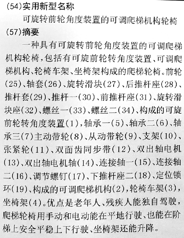 簡 介:可上下樓梯的爬梯輪椅。可旋轉(zhuǎn)前輪的智能全自動上下樓梯的帶履帶式爬樓輪椅。能獨(dú)立自駕駛,可爬樓、可下樓、可電動、可手動、座椅能升降。