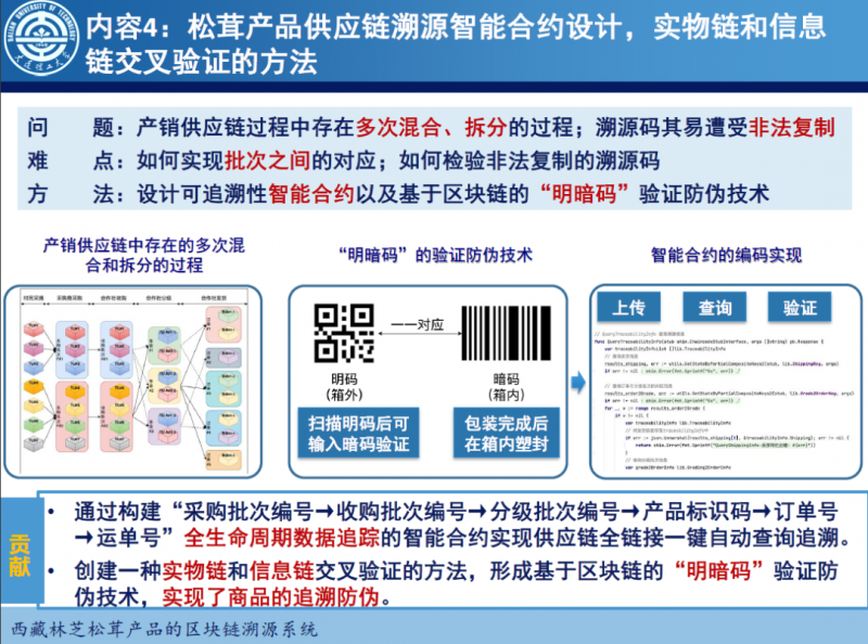 專(zhuān)家組經(jīng)評(píng)議認(rèn)為,成果針對(duì)松茸和靈芝等“名優(yōu)特”高附加值農(nóng)產(chǎn)品溯源難題,創(chuàng)建了我國(guó)第一個(gè)面向松茸和靈芝等“名優(yōu)特”高附加值農(nóng)產(chǎn)品的區(qū)塊鏈溯源系統(tǒng),基于區(qū)塊鏈技術(shù)設(shè)計(jì)了一種能夠?qū)崿F(xiàn)實(shí)物鏈和信息鏈交叉驗(yàn)證的“明暗碼”驗(yàn)證防偽技術(shù),建立基于區(qū)塊鏈架構(gòu)的鏈上鏈下數(shù)據(jù)融合機(jī)制,解決了農(nóng)產(chǎn)品區(qū)塊鏈溯源系統(tǒng)“如何建”的難題,具有重要的理論價(jià)值和實(shí)際應(yīng)用價(jià)值。成果研發(fā)的“松茸產(chǎn)品區(qū)塊鏈溯源系統(tǒng)”在西藏達(dá)娃曲珍實(shí)業(yè)有限公司及林芝市巴河鎮(zhèn)朱拉松茸合作社開(kāi)展了實(shí)際應(yīng)用和示范工程建設(shè),解決了松茸和靈芝等“名優(yōu)特”高附加值農(nóng)產(chǎn)品的溯源難題,已取得明顯的經(jīng)濟(jì)和社會(huì)效益。成果面向我國(guó)松茸和靈芝等“名優(yōu)特”高附加值農(nóng)產(chǎn)品的溯源需求,為松茸等高附加值農(nóng)產(chǎn)品供應(yīng)鏈溯源提供新的解決方案,提升了農(nóng)產(chǎn)品供應(yīng)鏈信息的透明度并實(shí)現(xiàn)了溯源信息的不可篡改性,提高了消費(fèi)者對(duì)松茸等高附加值農(nóng)產(chǎn)品的信任程度,對(duì)于提升松茸產(chǎn)品供應(yīng)鏈數(shù)字化水平和降低農(nóng)產(chǎn)品企業(yè)經(jīng)營(yíng)成本具有重要意義,推廣應(yīng)用前景廣闊。成果總體達(dá)到國(guó)內(nèi)領(lǐng)先水平,其中“基于區(qū)塊鏈的‘明暗碼’驗(yàn)證防偽技術(shù)”及“‘雙軌’鏈上鏈下數(shù)據(jù)融合機(jī)制”達(dá)到國(guó)際先進(jìn)水平。