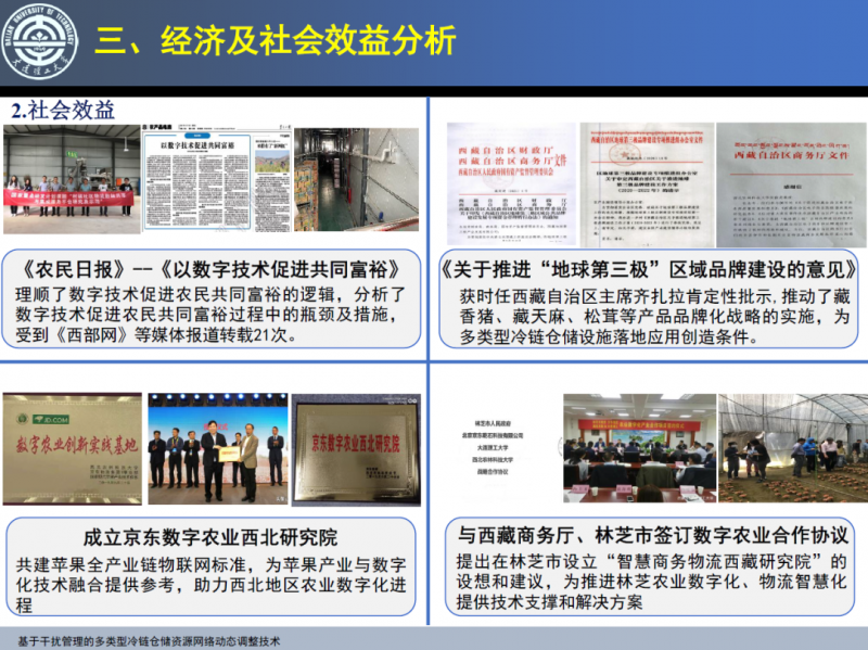 專家組經(jīng)評議認(rèn)為,成果針對生鮮農(nóng)產(chǎn)品多類型冷鏈倉儲資源網(wǎng)絡(luò)動態(tài)調(diào)整難題,采用文獻(xiàn)研究、實(shí)地調(diào)研、運(yùn)籌優(yōu)化以及模擬仿真等方法,建立了平臺模式多目標(biāo)下冷鏈倉儲資源網(wǎng)絡(luò)動態(tài)調(diào)整優(yōu)化框架,構(gòu)建了基于改進(jìn)Box splitting與自適應(yīng)大鄰域搜索的多目標(biāo)優(yōu)化高效求解方法,有利于解決冷鏈倉儲資源網(wǎng)絡(luò)受干擾下的動態(tài)調(diào)整難題,富有創(chuàng)新性,具有重要的學(xué)術(shù)價值與應(yīng)用價值。成果研發(fā)的基于干擾管理的多類型冷鏈倉儲資源網(wǎng)絡(luò)動態(tài)調(diào)整系統(tǒng),通過嵌入村鎮(zhèn)社區(qū)物流數(shù)據(jù)共享與集成平臺,在陜西、黑龍江等多家涉農(nóng)企業(yè)開展了示范應(yīng)用,為解決村鎮(zhèn)農(nóng)產(chǎn)品多類型冷鏈倉儲資源網(wǎng)動態(tài)調(diào)整難題提供了新方法和新技術(shù),經(jīng)濟(jì)和社會效益較顯著。成果面向我國村鎮(zhèn)多類型冷鏈倉儲資源網(wǎng)絡(luò)動態(tài)調(diào)整實(shí)際需求,實(shí)現(xiàn)了多種冷鏈倉儲資源的高效配置與動態(tài)調(diào)整,化解了有干擾、多目標(biāo)情形下冷鏈倉儲資源的動態(tài)調(diào)整難題,有利于促進(jìn)我國多類型冷鏈倉儲資源社會化服務(wù)平臺模式的建立,對于提高村鎮(zhèn)冷鏈倉儲運(yùn)營管理水平和降低冷鏈倉儲基礎(chǔ)設(shè)施運(yùn)營成本具有較大的應(yīng)用價值和推廣前景。該成果總體達(dá)到國內(nèi)先進(jìn)水平。