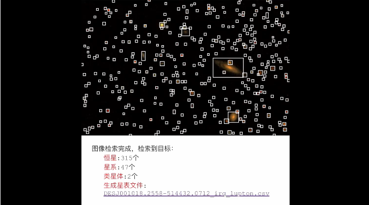 借助圖像描述等技術(shù),可以對天文圖像進(jìn)行自動分析,并通過文字、圖像、語音等直接、友好的方式提供反饋結(jié)果。圖6展示了對暗能量相機(jī)遺珍巡天的一幅圖像自動分析并生成文字反饋的示意圖。