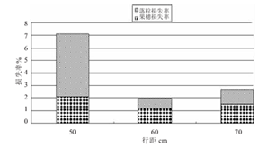圖1 單產(chǎn)與種植密度間的關系 | 圖2 60 cm收獲機具的收獲損失與 種植行距的關系 |