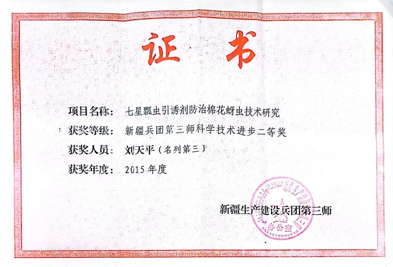 本專利發(fā)明項目研究獲得2015年度新疆生產(chǎn)建設(shè)兵團第三師科學技術(shù)進步二等獎。