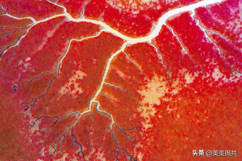 紅海灘是一種叫作堿蓬草的植物大規(guī)模生長(zhǎng)形成的,堿蓬草喜歡生長(zhǎng)在鹽堿性的土壤當(dāng)中,這是一種在海邊常見(jiàn)的草類(lèi),通常只有20-60cm,看上去枝體纖細(xì),而且還有多級(jí)的枝杈,最顯著的特點(diǎn)就是對(duì)生的葉線(xiàn)形上有著紅色條紋。