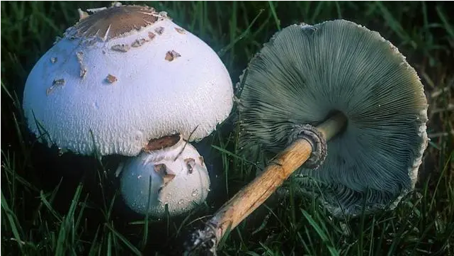 在城市里,最常見且危險的毒蘑菇非大青褶傘莫屬。這種蘑菇在雨后的草地上非常常見,碩大的白色菌蓋上有一些深色的塊狀鱗片,從中央到邊緣逐漸稀疏,菌柄上有戒指一樣的菌環(huán),成熟后菌褶青灰色。