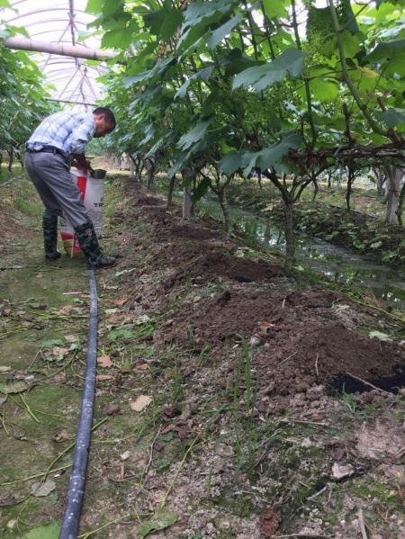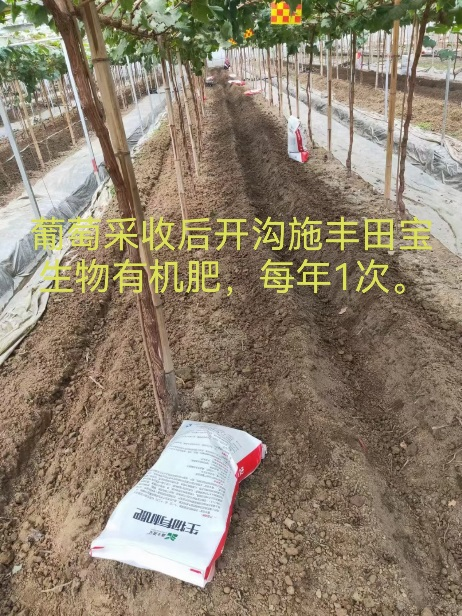 在春季至果實膨大前,每畝用豐田寶生物有機肥400公斤左右(預(yù)計產(chǎn)量的10%),溝施于根部兩側(cè),埋土,壓實,澆透水;果穗落花后澆水時,每畝隨水澆入1公斤慧動力,促進生長和提高抗病性