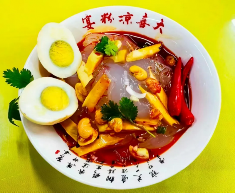 《東京夢華錄》有載,涼粉不僅是一道可口的小吃,還有消暑祛熱的功效。從營養(yǎng)角度來看,涼粉含水量達(dá)80%,在給人體補(bǔ)充水分的同時,也起到了促進(jìn)新陳代謝,潤腸通便,給腸道“減負(fù)”的作用。其次,涼粉里的天然植物膠質(zhì)是天然的“養(yǎng)顏因子”,它不僅能溫和滋養(yǎng)肌膚,讓皮膚保持水潤彈性,還能由內(nèi)而外改善氣色,潛移默化地調(diào)節(jié)內(nèi)分泌,幫助女性穩(wěn)住身體狀態(tài)。最后,大量的碳水化合物是它的“隱藏屬性”,食用后極易產(chǎn)生飽腹感,讓人享受美味時,不自覺減少其他高熱量食物的攝入,悄然成為瘦身路上的“助力者”,讓人們滿足味蕾的同時,也能輕松的管理身材。