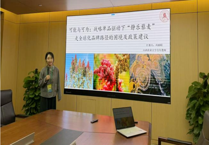 鞏麗娟老師作為“家鄉(xiāng)特優(yōu)農(nóng)產(chǎn)品推薦官”行動(dòng)品牌手記第11期作者推薦了忻州靜樂的藜麥,張嘉莉同學(xué)也在品牌手記第46期中推薦了忻州寧武的毛健茶。在深入產(chǎn)業(yè)調(diào)研的基礎(chǔ)上,她們將實(shí)踐觀察轉(zhuǎn)化為學(xué)術(shù)成果,并在論壇中分別進(jìn)行匯報(bào)。在青年學(xué)者專場(chǎng)2中,鞏麗娟老師以《可能與可為:戰(zhàn)略單品驅(qū)動(dòng)下“靜樂藜麥”走全球化品牌路徑的困境及政策建議》為題展開分享,聚焦區(qū)域特色農(nóng)產(chǎn)品全球化品牌核心痛點(diǎn),結(jié)合靜樂藜麥作為戰(zhàn)略單品的“可能”潛力與走全球化品牌進(jìn)程中面臨的瓶頸,提出了有針對(duì)性的政策建議。在研究生專場(chǎng)6中,張嘉莉同學(xué)以《農(nóng)產(chǎn)品區(qū)域品牌矩陣運(yùn)營(yíng)困境與策略:基于戰(zhàn)略三角模型分析——以忻州雜糧品牌矩陣為例》為題進(jìn)行分享,立足忻州市這一地市級(jí)行政單位,運(yùn)用戰(zhàn)略三角模型對(duì)忻州市雜糧品牌矩陣的運(yùn)營(yíng)困境進(jìn)行系統(tǒng)剖析,并相應(yīng)提出優(yōu)化策略。