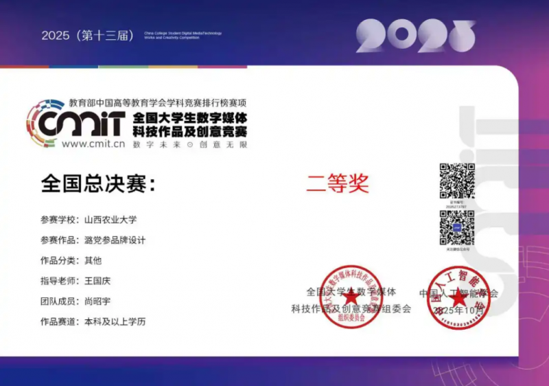 10月下旬,在第十三屆全國大學(xué)生“數(shù)字媒體科技競(jìng)賽”中,“大學(xué)生品牌推薦官” 尚昭宇同學(xué)在團(tuán)隊(duì)指導(dǎo)教師王國慶教授的指導(dǎo)下,憑借《潞黨參品牌設(shè)計(jì)》文創(chuàng)作品脫穎而出,榮獲全國總決賽二等獎(jiǎng)、山西賽區(qū)一等獎(jiǎng),王國慶老師獲評(píng)“優(yōu)秀指導(dǎo)教師獎(jiǎng)”。