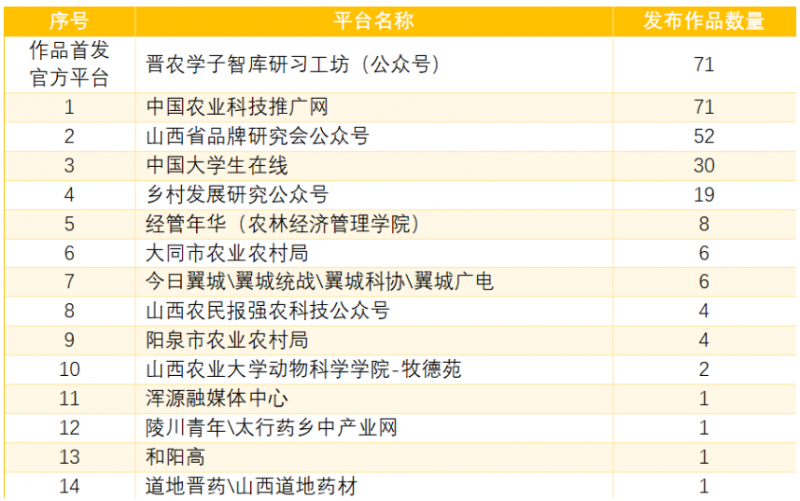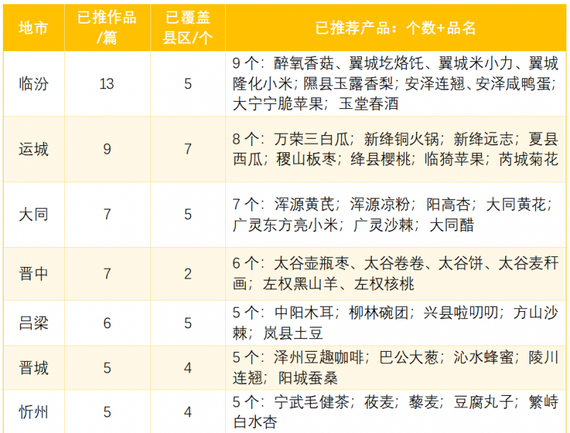 核心提示:按地市、縣區(qū)、學(xué)院、媒體等多視角分析大學(xué)生品牌推薦官活動(dòng)廣泛的影響力。一、地市排排座大學(xué)生品牌推薦官公益行動(dòng)已覆蓋山西11個(gè)地市,省外的河北、山東3個(gè)地級(jí)市4個(gè)縣區(qū)。臨汾市:13篇作品,涉及5縣區(qū)(10篇品牌手記,1篇品牌智庫(kù)建議,2部品牌短視頻)翼城(6篇):歷山之麓“醉氧香菇”探秘錄3;東升與他的“醉氧山珍”品牌故事4;翼城風(fēng)味“圪烙饦”非遺文化探秘錄6;甜糯玉米品牌“米小力”長(zhǎng)成啟示錄12;翼城隆化小米的品質(zhì)探秘22;石上鄉(xiāng)愁(品牌短視頻3)隰縣(3篇):隰縣“玉露香”的自述0;走進(jìn)隰縣梨園:玉露香