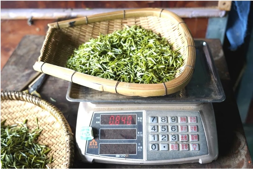 山上茶園采茶忙,山下茶廠制茶香。在明英村的都勻市勻盛茶業(yè)有限公司制茶廠房內(nèi),公司負(fù)責(zé)人鄭盛長熟練地將村民們采摘的茶青稱重結(jié)算報酬,另一邊,炒茶師傅們雙手嫻熟地翻炒電炒鍋中的茶青,輕盈柔軟的茶青漸漸干燥、卷曲、緊細(xì),待白色的絨毛顯現(xiàn),一鍋香氣撲鼻的都勻毛尖茶就制作完成。