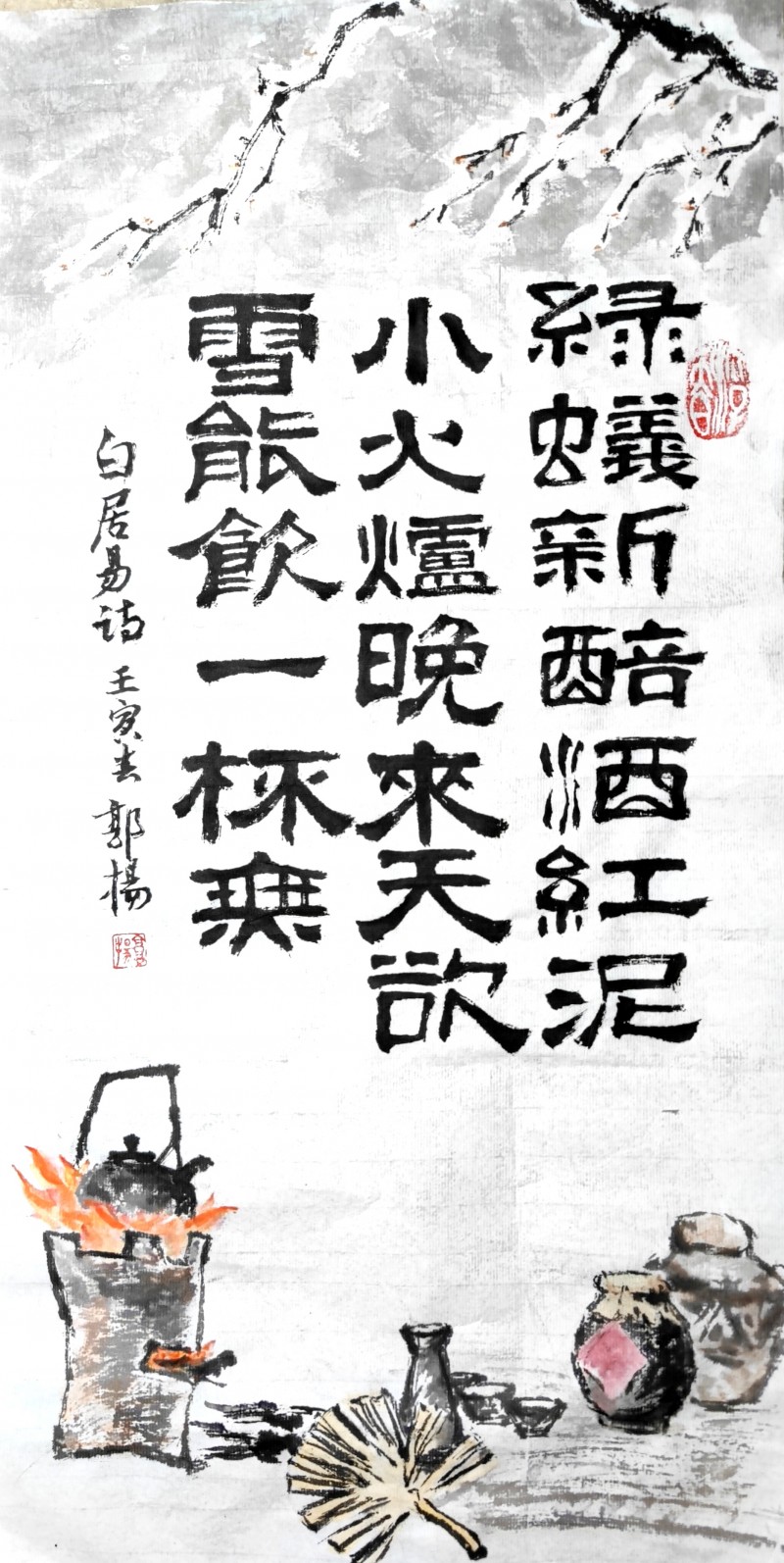 有感近日京城大雪,隨仿白居易《問(wèn)劉十九》詩(shī)一首:“綠柳新芽抽,紅杏尚含羞。春來(lái)天又雪,暢飲杯停無(wú)?”,并書(shū)原《問(wèn)劉十九》以分享共賞。